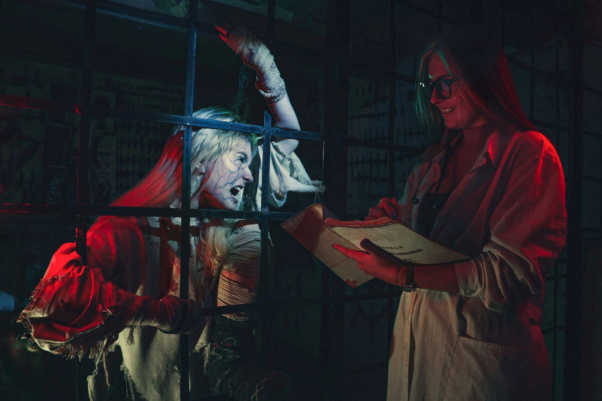 Актерская игра была интерактивно-пугающей. Образ главной антагонистки можно увидеть на фото – это психбольная в растрепанной и окровавленной одежде. В какой-то момент мы начали воспринимать ее абсолютным злом. Но если приглядеться, то везде были расставлены намеки, заставляющие задуматься об истинной природе личности этого человека. Можно было понять, что же с ней случилось на самом деле. Порой она могла нарушать законы гравитации, оказываясь там, где это казалось невозможным. И пусть речь была столь же агрессивна, как и весь образ, все равно оставалась возможность проявить навыки интерактива. Немаловажную роль играл встречающий персонаж в лице помощницы главного врача. С ней можно было и поболтать, и посмеяться, и даже испугаться, поскольку для героя характерны перепады настроения.