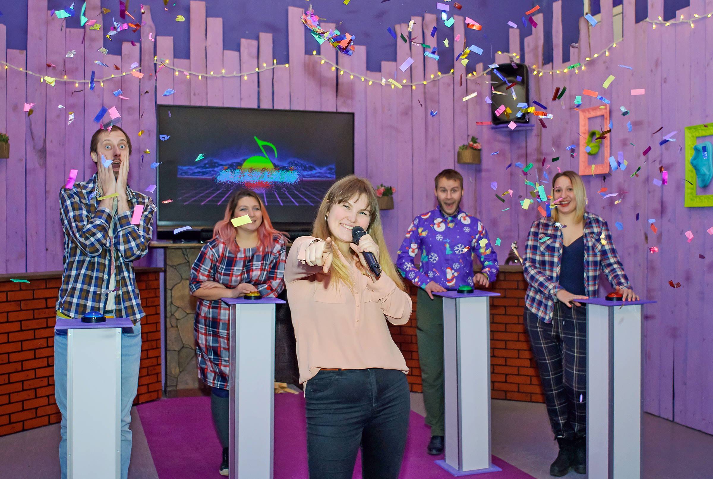 Ведущий у нас был и певец, и танцор, и пародист, и стендап-комик. Бенефис одного актера, а мы в тандеме на бэк-вокале и подтанцовке. В начале от его просто бешеной энергетики некоторые из нашей команды даже опешили и растерялись, но потом драйв настолько поглотил каждого, что, признаемся, игра напоминала аттракцион музыки, юмора, танцев и дружеского единения. Мы давно не испытывали таких чувств и эмоций!